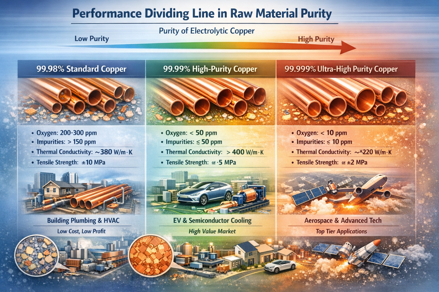 | Renhetsnivå för råmaterial | Kärnföroreningsinnehåll (ppm) | Kopparrörsprestanda efter bearbetning | Tillämpliga scenarier | Råvaruanskaffningskostnad (RMB/ton) | Produktvinst per ton (RMB) | Produktdefektfrekvens |
