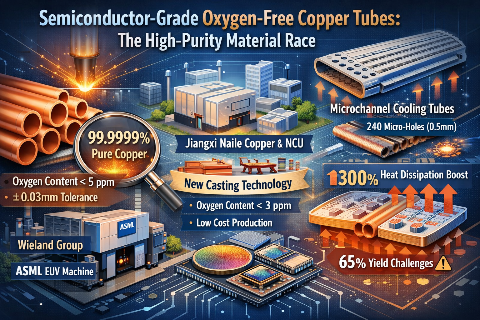 Genombrott i kostnadseffektivt alternativ dyker upp. Jiangxi Naile Copper, i samarbete med Nanchang University, utvecklade en "ultra-lågt syredelad horisontell kontinuerlig gjutningsmetod" som kontrollerar syrehalten under 3 ppm till en åttondel av kostnaden för importerade vakuummetoder. Denna innovation har kommit in i leveranskedjan för SMICs 14nm produktionslinjer. Mer avancerade applikationer inkluderar kylrör på wafernivå med mikrokanaldesigner (t.ex. 240 mikrohål med 0,5 mm diameter) för att förbättra värmeavledningseffektiviteten med 300 %, även om utbytet fortfarande är en utmaning vid 65 %.