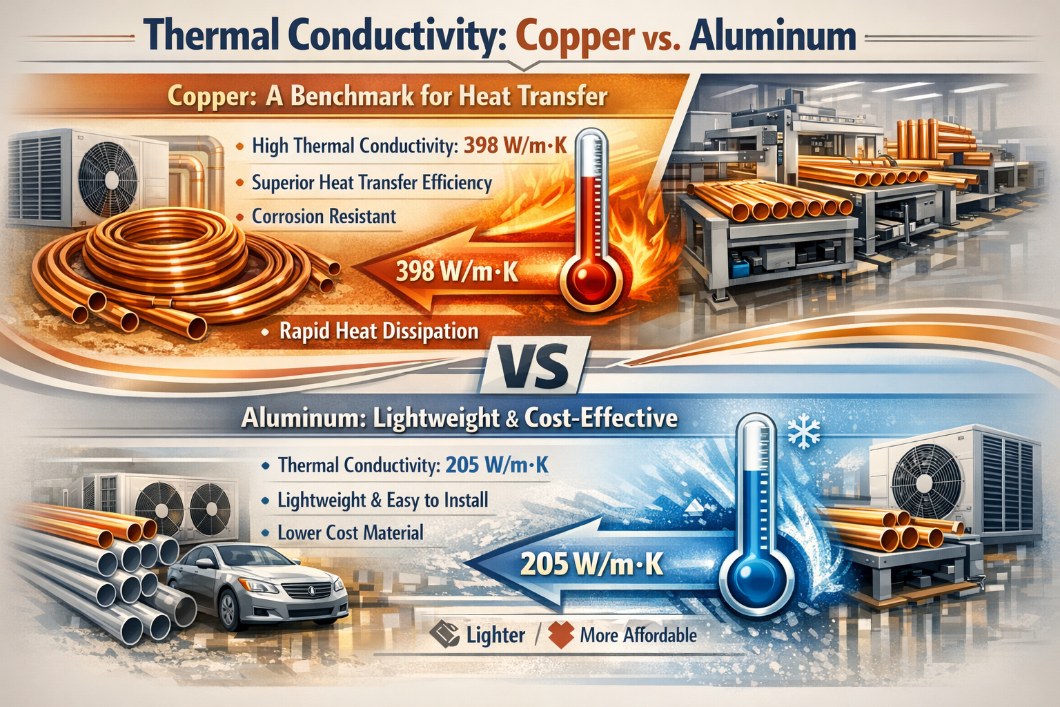 Den här tabellen belyser de distinkta skillnaderna mellan koppar och aluminium rör, med koppar erbjuder överlägsen värmeöverföring men till en högre kostnad, medan aluminium är mer lätt och kostnadseffektivt men kommer med kompromisser i prestanda och hållbarhet.