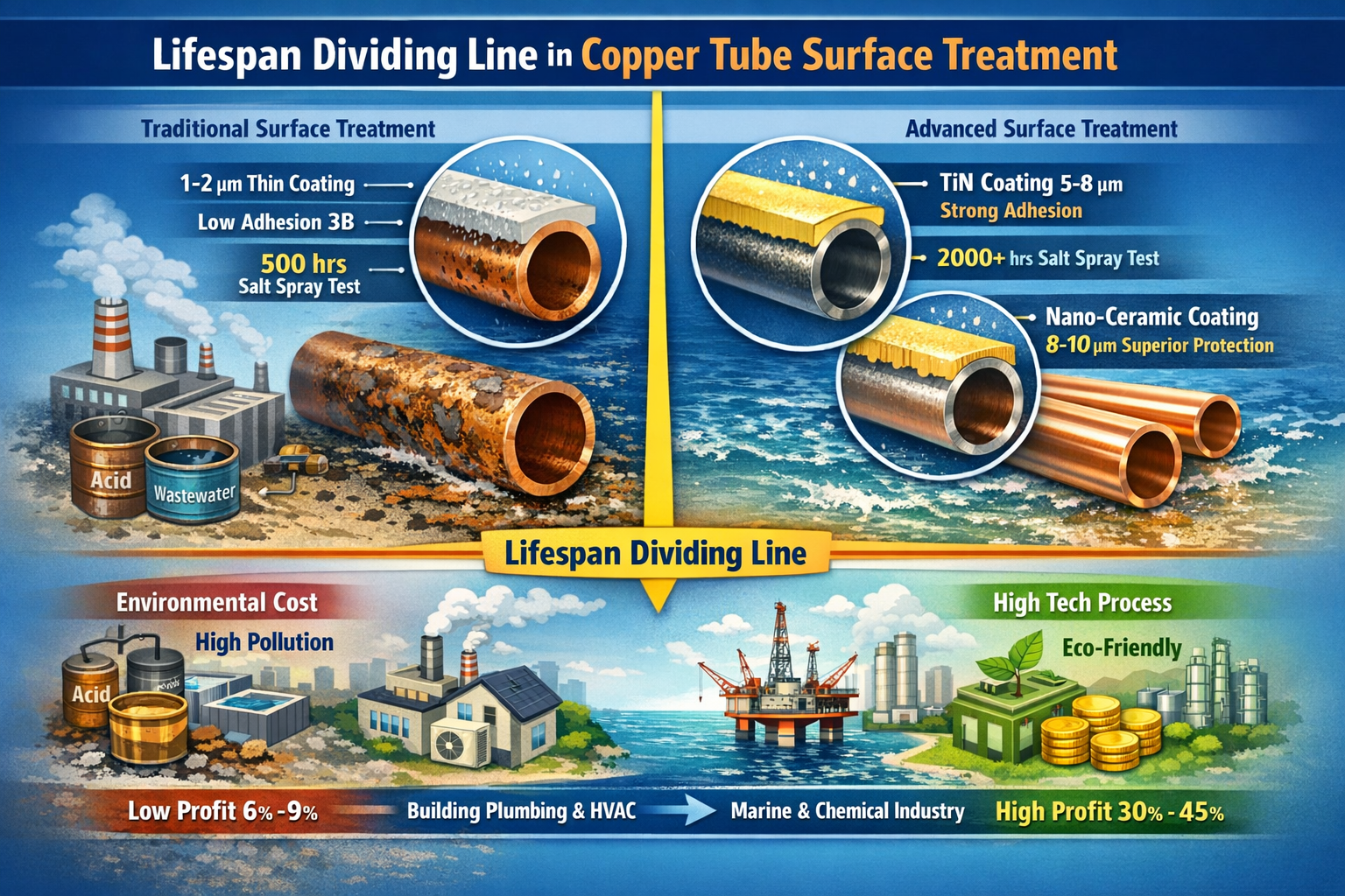 "Båda är kopparrör används i utrustning för avsaltning av havsvatten , men produkterna vi behochlat med konventionell betning och passivering visade gropkorrosion och läckage på mindre än 3 år i den marina miljön; medan konkurrentens produkt, behandlad med vakuumjonbeläggningsteknik , har en livslängd på över 15 år och dess enhetspris är 30 % högre än vårt.” Liu, teknisk chef för ett rörföretag i kopparlegeringar i Qingdao, höll upp två sektioner av kasserade och intakta kopparrör, vilket avslöjade det dolda värdet av ytbehandlingsteknik. Ytbehandling, som det sista steget i produktionen av kopparrör, kan tyckas vara en enkel hjälpoperation för "rostborttagning och beläggning", men det bestämmer direkt produktens korrosionsbeständighet, slitstyrka , och livslängd , och further impacts its market positioning and added value. Currently, most domestic copper tube manufacturers still rely on traditional surface treatment processes such as betning och vanlig passivering , vilket gör deras produkter olämpliga för krävande miljöer som t.ex marin, kemisk och avancerad vattenrening ; ett fåtal företag har dock uppgraderat sina raffinerad ytbehandlingsteknik , vilket gör att deras kopparrör kan bibehålla stabil prestanda i extrema miljöer och enkelt fånga den avancerade marknaden. denna tunna" skyddsfilm " håller på att bli en kärndetalj som skiljer konkurrenskraften för kopparrörsprodukter, och den har också nyckeln till branschens uppgradering från "kvalificerad" till "hög kvalitet."