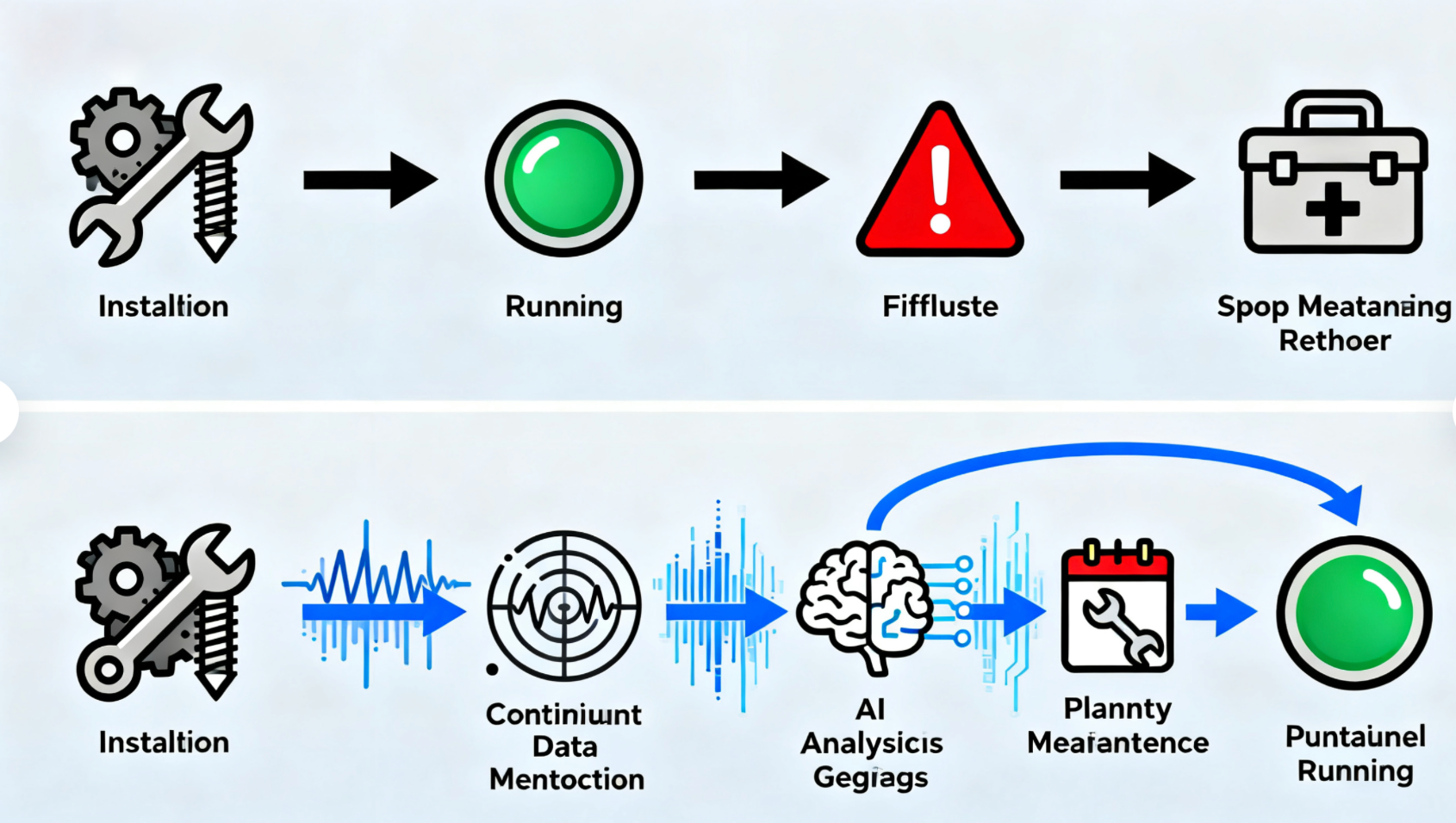 Bildtext: Utvecklingen av underhållsmodeller: från passiva felsvar till proaktiva, databaserade prediktiva interventioner, vilket avsevärt förbättrar systemets tillförlitlighet.