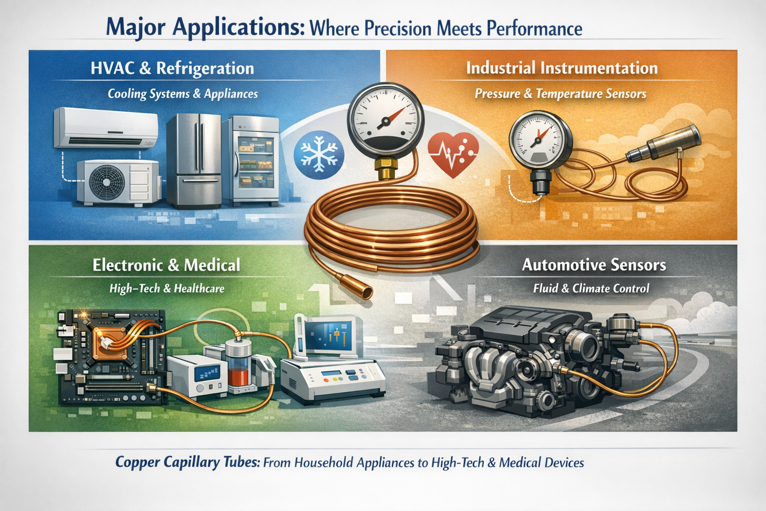 På grund av deras förmåga att kontrollera vätskeflödet med extrem noggrannhet, finns kopparkapillärrör i allt från hushållsapparater till livräddande medicinsk utrustning.