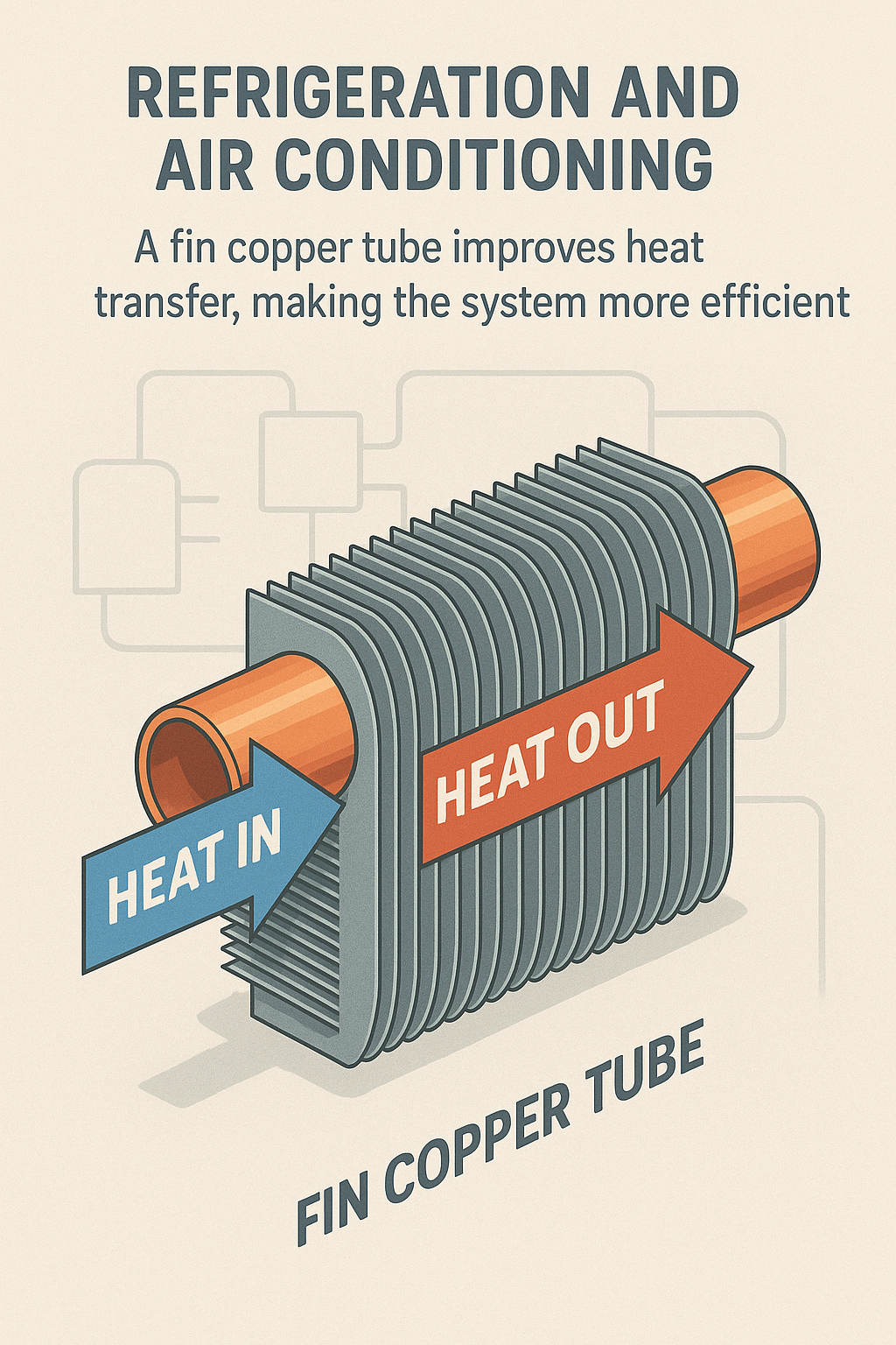 I luftkonditioneringssystem används Fin kopparrör i stor utsträckning i förångare och kondensor. Förångaren absorberar värme från luften inne i byggnaden, medan kondensorn avger värmen till utomhusmiljön. Användningen av fenkopparrör i båda dessa komponenter förbättrar den totala värmeöverföringseffektiviteten, vilket leder till bättre kylningsprestanda och lägre energiförbrukning.